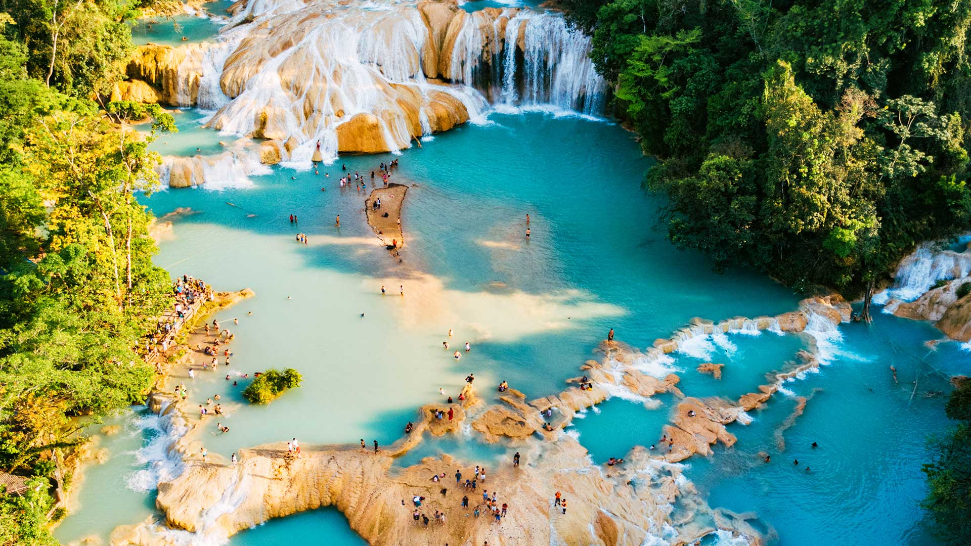 Départ en matinée pour la région de Palenque. En route, halte aux cascades d’Agua Azul, l’une des plus spectaculaires beautés naturelles d’eau turquoise du Mexique. Agua Azul est également un parc national protégé couvrant plus de 2 500 hectares de jungle et de cours d'eau. En après-midi, arrivée à Palenque, l’un des sites les plus enchanteurs du Mexique, au cœur de la forêt tropicale. Souper à l'hôtel et animation de Piñata. PD/D/S