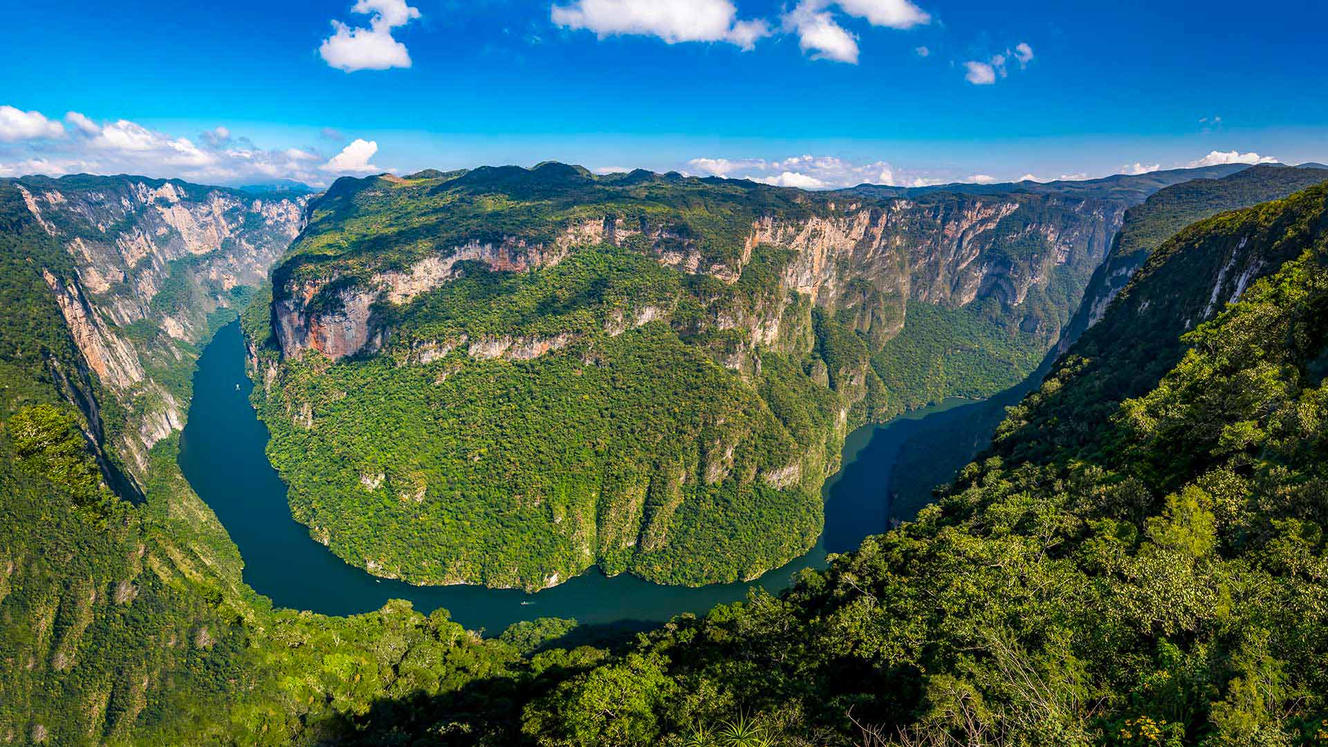 Promenade en bateau sur le Rio Grijalva, dans l'impressionnant canyon du Sumidero où le fleuve serpente entre des parois pouvant atteindre jusqu’à 1 000 mètres de hauteur. Au cours de la balade, on peut admirer le « sapin de Noël », une paroi rocheuse érodée par une chute d'eau et recouverte de mousse. Tour de combi, sorte de taxi collectif typique du pays. Dîner dans un restaurant local de Chiapas de Corzo pour déguster un plat régional. Départ vers San Cristóbal de Las Casas. PD/D